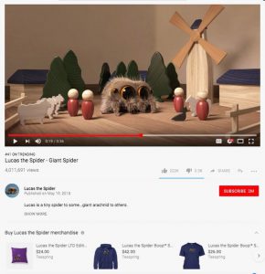 今回の大きな変化としては、YouTubeの動画の下に棚が表示されるようになり、プラットフォームがヴァーチャルストアのようになる点です。商品購入は直接Teespring上で行うことになっています。YouTubeはすでに一部のユーザーを対象にテストを行った模様で、発表によれば、「Lucas the Spider」(ルーカス・ザ・スパイダー:クモが主人公のアニメーションを製作しているチャンネルで、現在までに10作品が公開されている)は1カ月未満で約100万ドル(約1.1億円!)を売り上げたというから驚き!!です。